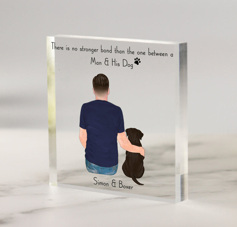 Our Customisable Freestanding Man & Pet Illustration Printed on a clear Acrylic Block makes a thoughtful unique Birthday Gift for Him/Dad Gift/Boyfriend Present/Work Colleague/Pet Lover