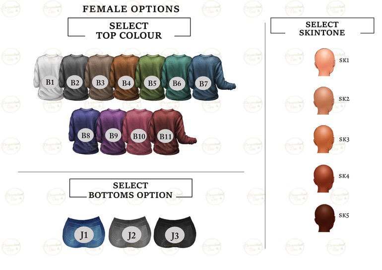 Choose characters: hairstyles, skin tones, outfits
