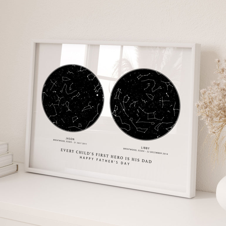 Our Customisable Night Sky Print - 2 children version - is a thoughtful unique gift or keepsake for your Dad, Grandad, Stepdad or Bonus Dad. Perfect gift for Fathers Day, Birthdays or for New Dads/Grandads. UNFRAMED PRINT.