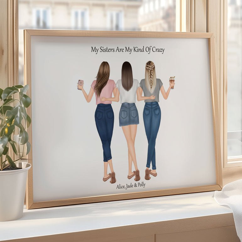 Personalised Sister Gift, Custom Sister print, 3 sisters Portrait, illustration picture, Unique Birthday gift BFF Customised Letterbox Gift
