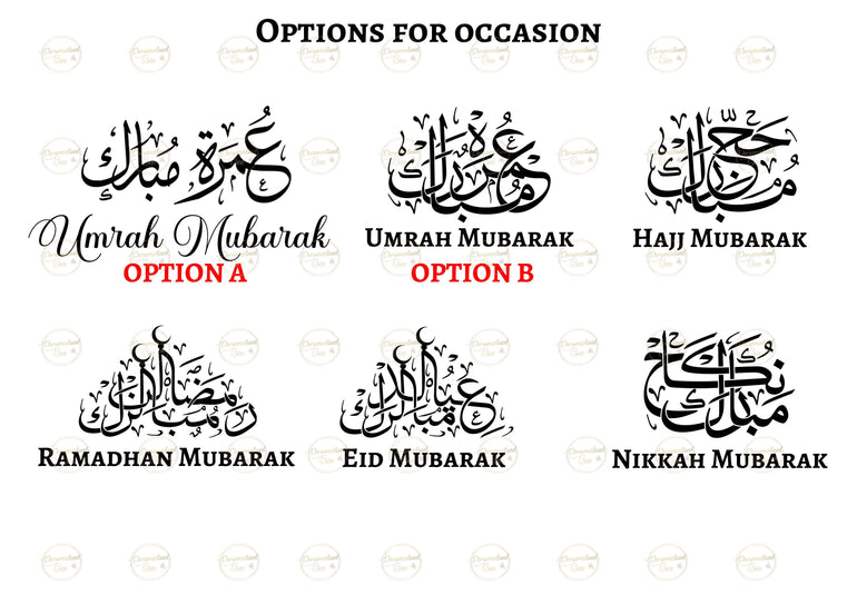 Upon ordering, you have the opportunity to customise the wording for this special gift. Choose from 'Umrah Mubarak', 'Eid Mubarak', or 'Ramadan Mubarak' as the central message, depending on the occasion. Furthermore, you can add your loved ones' names, creating a personalised touch that reflects the significance of their journey or celebration.