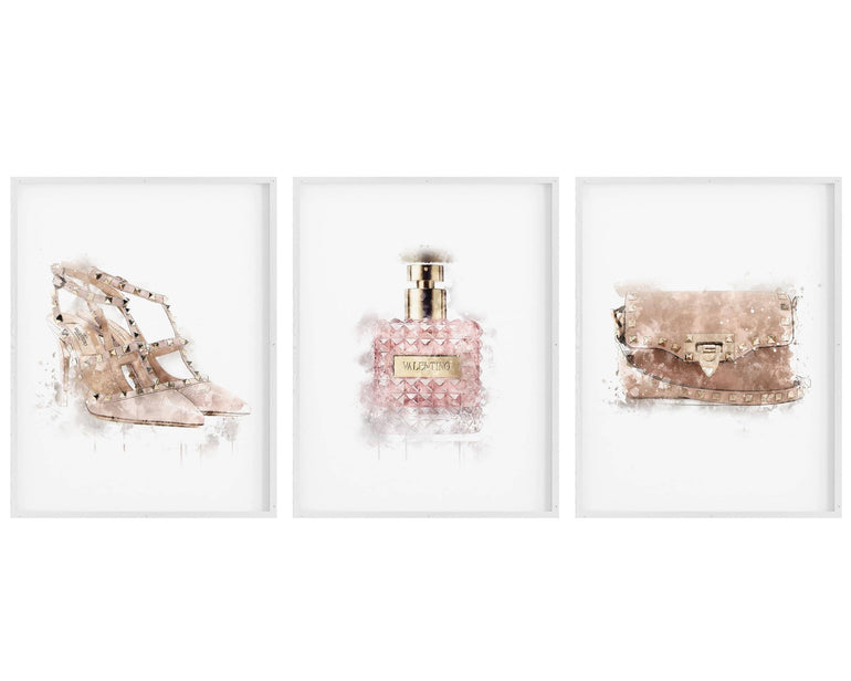 Set of 3 Fashion Prints - Blush Pink Watercolour Shoes, Bag and Perfume Bottle