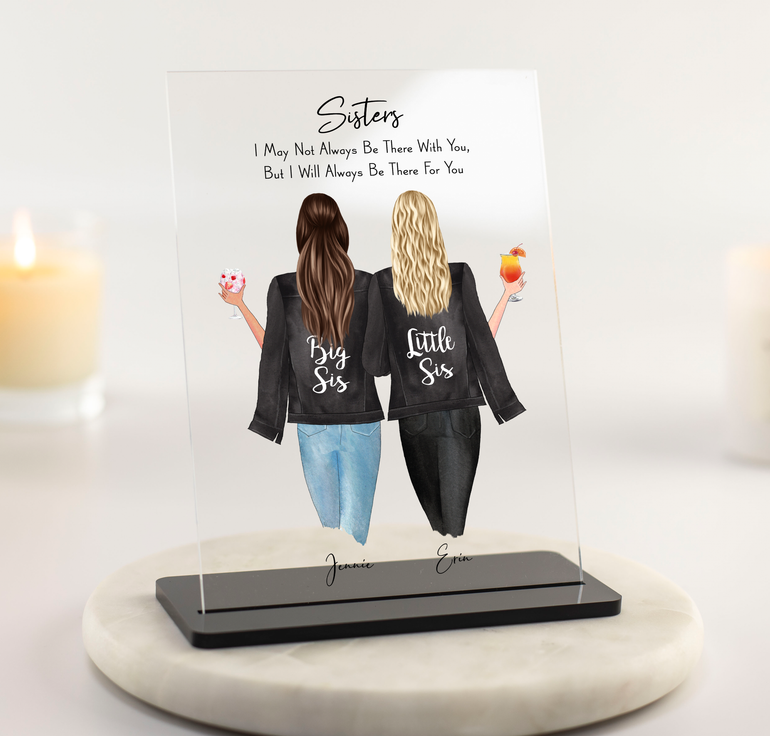 Personalised Sister illustration Acrylic Plaque with slimline stand. NO ADDITIONAL FRAME PURCHASE REQUIRED! Ready to gift to the recipient or send directly with no hassle of buying a frame