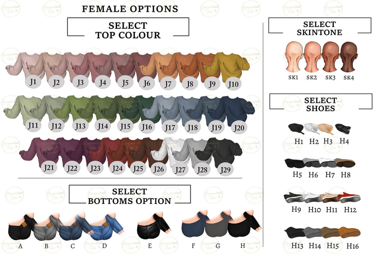 Hair, outfit and styling options are selected using the visual guides shown in the listing images.