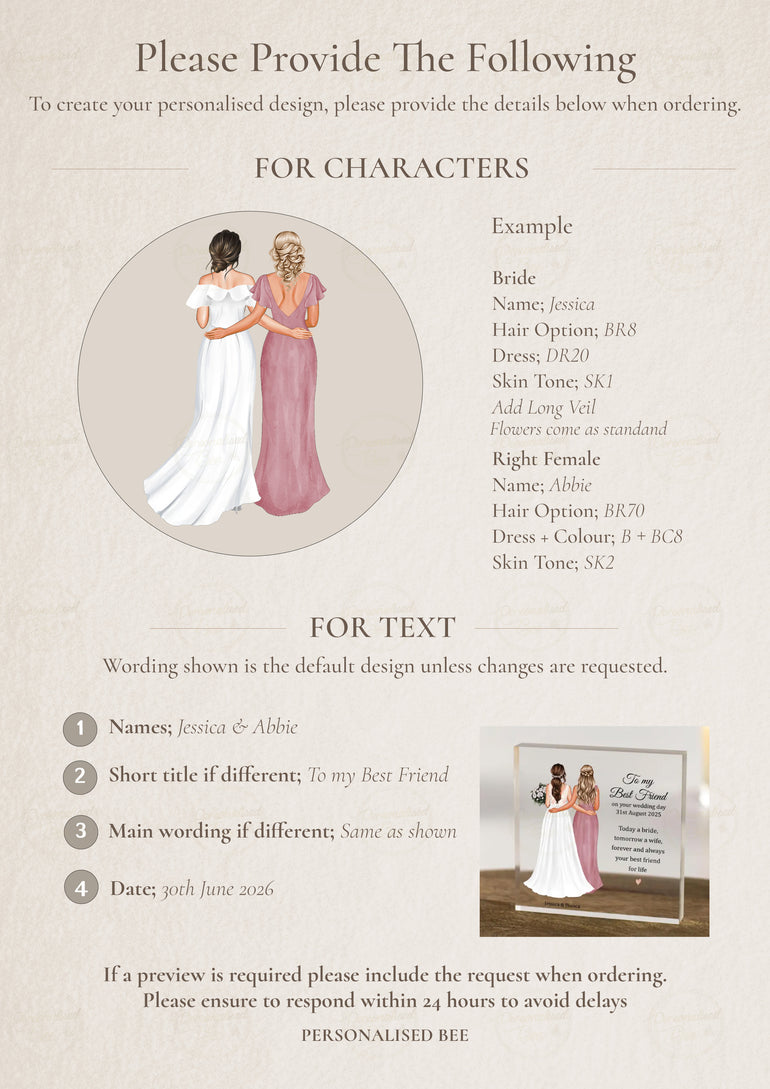 Featuring a beautifully illustrated bride and best friend standing side-by-side, this freestanding acrylic block captures the bond, memories, and friendship that lasts far beyond the wedding day. Each design is custom-made to reflect the people in your illustration — from hair and outfit choices to skin tones — creating a truly personal gift she’ll treasure forever.