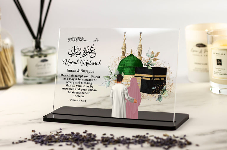 Celebrate the spiritual journey of Umrah or commemorate the blessed months of Ramadan and Eid with this exquisite Personalised Umrah Mubarak Couple Characters Acrylic Plaque. Featuring a stunning illustration of the Kaaba, the holiest site in Islam, this elegant and thoughtful gift is a perfect tribute to the faith and devotion of your loved ones.