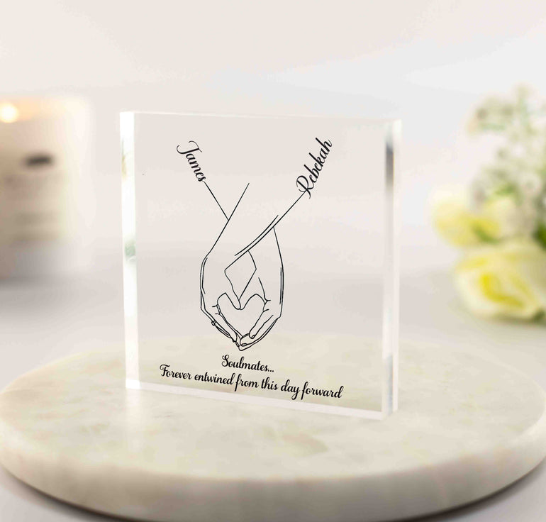 Our Customisable Freestanding 10cmx10cmx1.5cm Hands line art Couple Acrylic Block makes a thoughtful unique gift or keepsake for all occasions including anniversary's, weddings, birthdays, Galentine's day, New Home and Christmas.